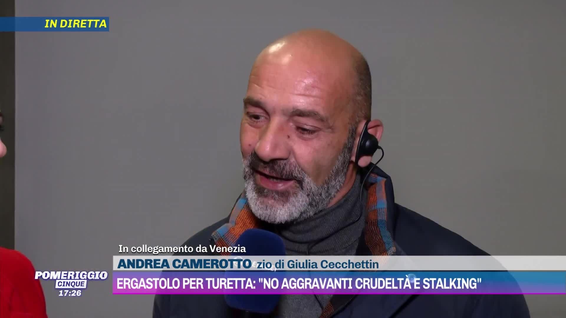 "Sono d'accordo con tutto quello che ha detto Gino, compreso il fatto che c'è da dibattere sulle aggravanti della crudeltà e dello stalking - ha aggiunto la zio di Giulia Cecchettin, Andrea Camerotto, soffermandosi sulle aggravanti non accolte riconosciute in aula -. Mi chiedo, in particolare, quali debbano essere le cose che portano a valutare la crudeltà in una situazione del genere".