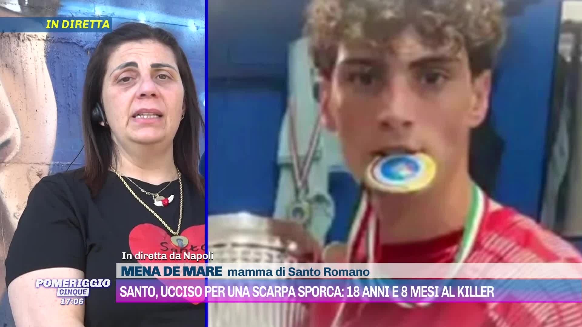 A Pomeriggio Cinque la mamma di Santo Romano, il ragazzo di 19 anni ucciso a San Sebastiano al Vesuvio (Napoli) per aver fatto da paciere in una discussione iniziata per futili motivi, commenta la sentenza emessa dal Tribunale dei minori di Napoli. Nel processo, che si è svolto con il rito abbreviato, il 17enne accusato dell'omicidio è stato condannato a 18 anni e 8 mesi di reclusione. Una pena che non soddisfa la mamma della vittima, Mena De Mare.