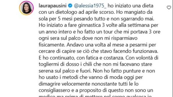 "Ho continuato, con fatica e costanza. Con volontà di togliermi di dosso i chili che non mi facevano stare serena sul palco e fuori. Non ho fatto punture e non ho usato i metodi che vanno di moda oggi per dimagrire velocemente nonostante tutti me lo consigliassero e, a proposito di questo, non sono un medico, ma prima di mettere nel corpo qualcosa io preferisco conoscere le possibili controindicazioni", ha aggiunto Laura Pausini.