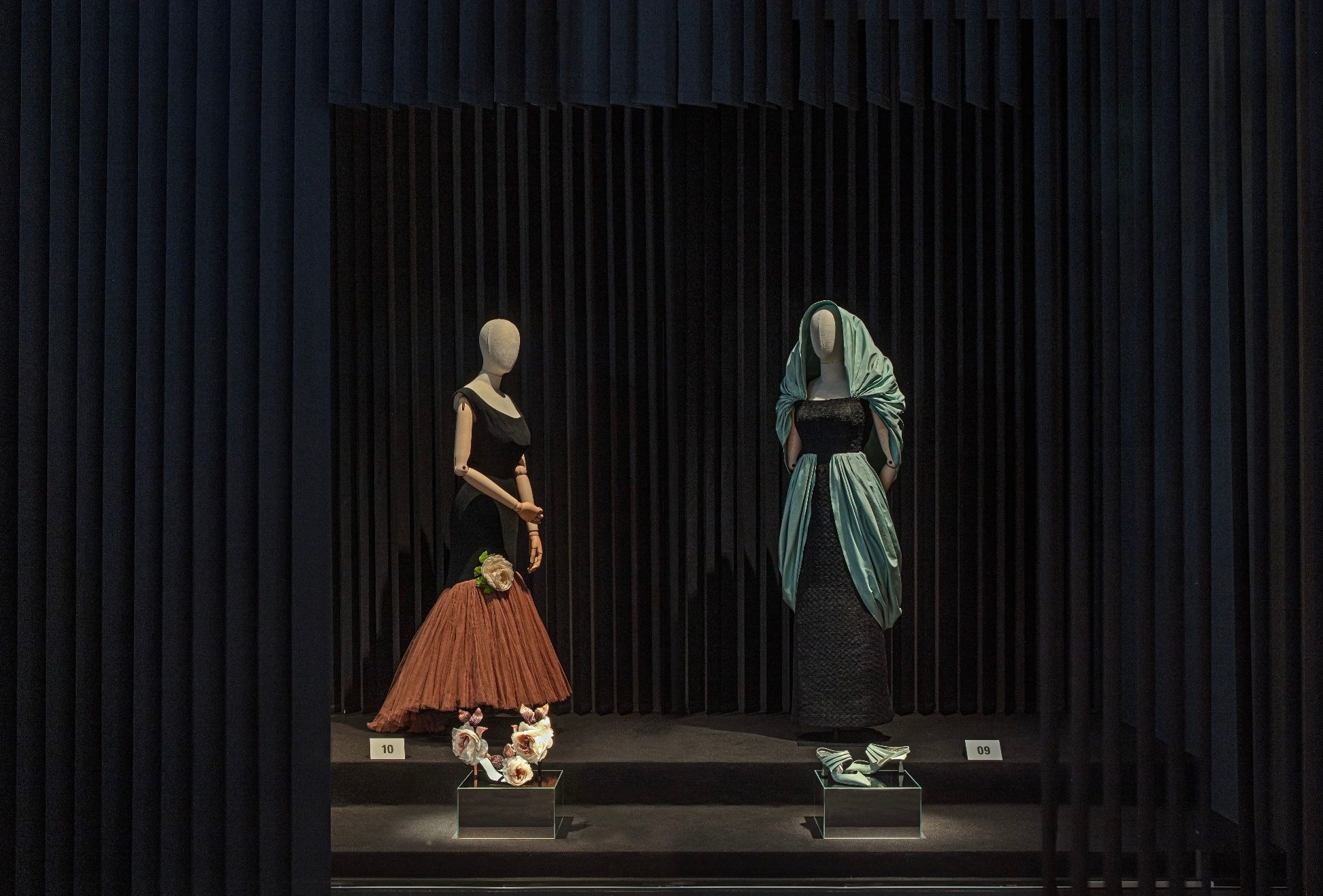 Progettato da Elisa Ossino Studio, la mostra valorizza le creazioni di Balenciaga tra scale, basamenti, specchi e tendaggi. L’obiettivo è enfatizzare linee, pieghe e volumi delle creazioni, per evidenziare la plasticità degli abiti e il loro aspetto architettonico. Del resto: “Un couturier deve essere un architetto per la forma, un pittore per il colore, un musicista per l’armonia e un filosofo per la misura”, diceva Cristóbal Balenciaga.