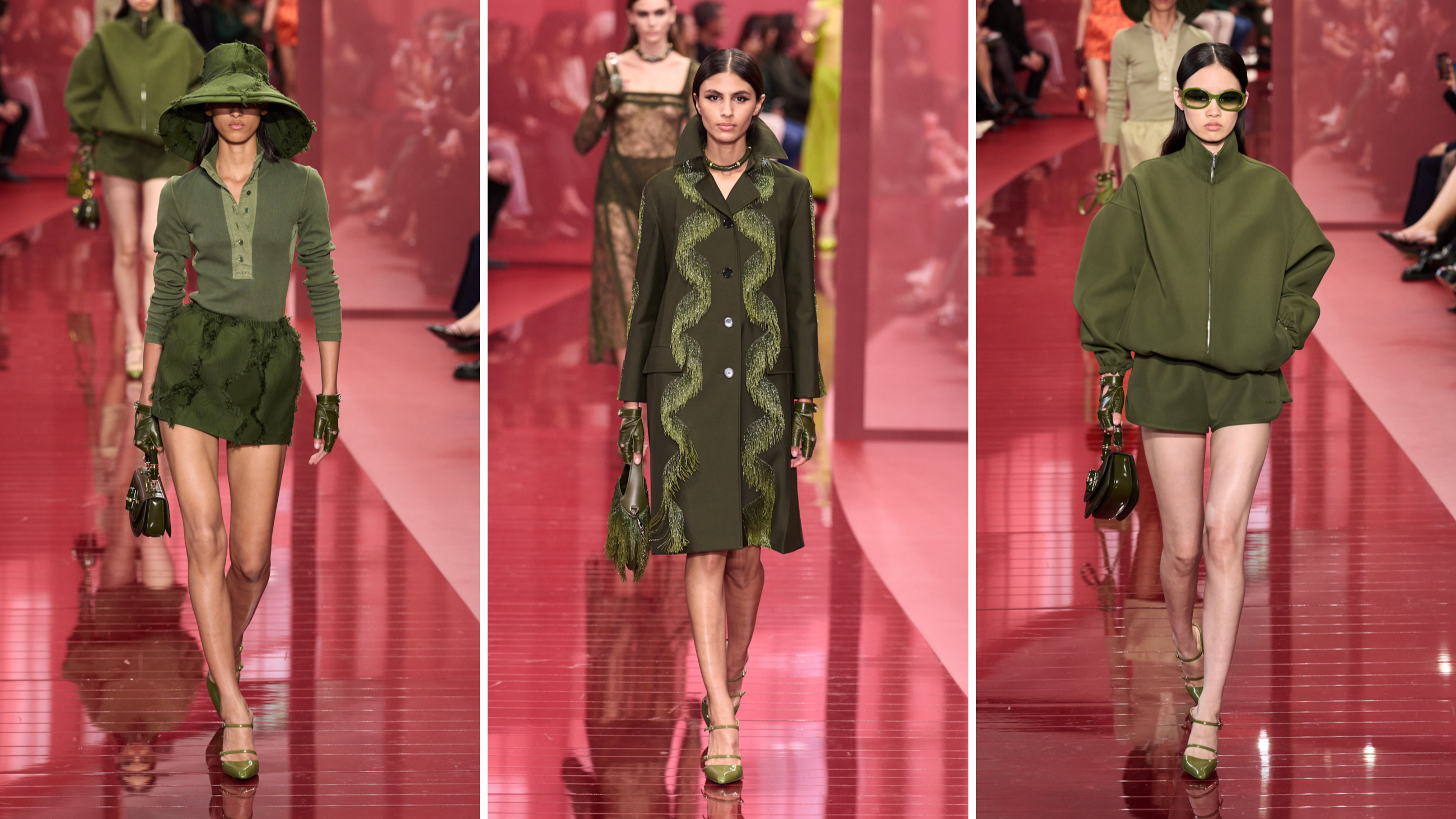 Il total look verde oliva è protagonista da Gucci, dove cappelli a falda larga si abbinano a polo e shorts che evidenziano la silhouette e soprabiti decorati abbracciano il corpo nei giorni più freschi. Le proposte della casa fiorentina puntano anche su felpe dalle maniche a sbuffo unite a pantaloncini, che regalano una forma morbida alla figura.