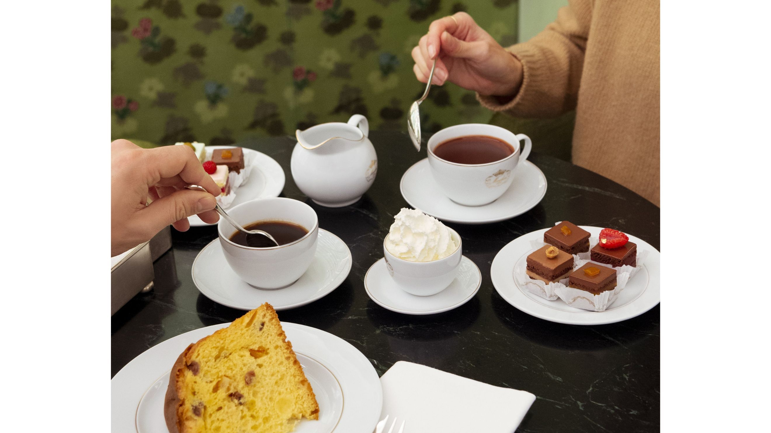 Marchesi 1824 interpreta la cioccolata calda con l’eleganza che contraddistingue la pasticceria milanese da due secoli (e che l’ha portata ad aprire un corner persino da Harrods a Londra). Oltre alla versione classica, si possono scegliere varianti con arancia candita e cannella, whisky, panna e zenzero candito, gelato alla crema o scaglie di lampone. La creazione dedicata alle Olimpiadi Milano-Cortina unisce VoV, panna montata e una cialda personalizzata, accompagnata dalle tradizionali chiacchiere.