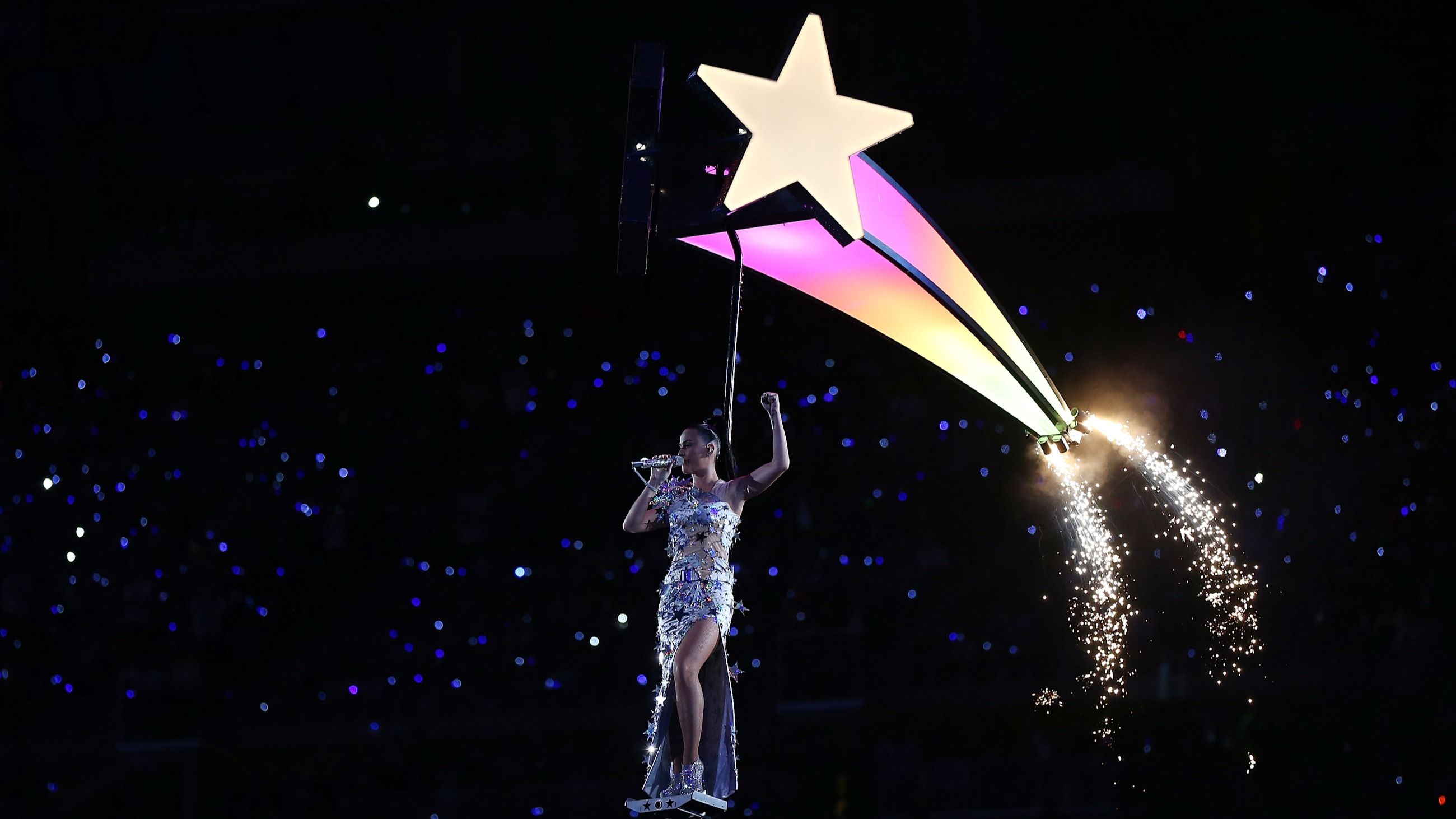 Che le stelle fossero nel destino di Katy lo si poteva intuire fin dall’inizio della sua carriera, ma, prima della missione spaziale, la cantante ce ne ha dato un assaggio il 1° febbraio 2015, durante l’esibizione al Pepsi Super Bowl XLIX Halftime Show allo stadio dell’Università di Phoenix, in Arizona. Con un abito da sera lamè argento firmato Jeremy Scott per Moschino incanta il suo pubblico.