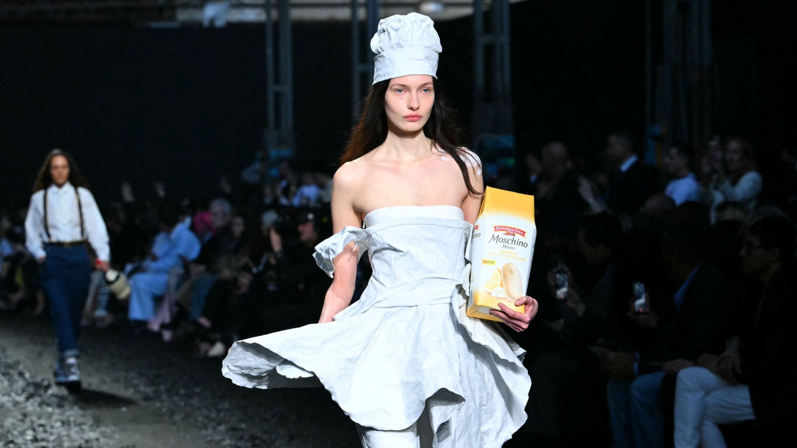 Cuciture a vista, che ricordano tessuti grezzi posti sul tavolo dei team stilistici. Stampe a pois su gonne e spalle oversize, bretelle e cinture con logo. Tessuti annodati a fiocco sorridono e cadono drappeggiati e tridimensionali lungo la silhouette. Il designer ha “moschinizzato” quattro stampe d’archivio dell’azienda tessile britannica Sanderson of London, dando vita a una collaborazione originale. I capi vanno a braccetto con borse divertenti. In mano alle modelle un piatto di spaghetti, una bottiglia di vino, una scatola di biscotti. L’umorismo si lega al sociale. La moda, secondo la filosofia Moschino, deve divertire, ma anche veicolare messaggi come quelli che rimandano alla salvaguardia del pianeta. A chiudere il defilé look arricchiti da accessori a forma di mondo e borse che ricordano sacchi della spazzatura che fanno da cornice a una t-shirt oversize con stampata la frase SOS Save Our World, per ricordare di impegnarsi a preservare il futuro. Nell’ottica di un riciclo che riguarda anche la moda, dove ogni pezzo di tessuto è prezioso.