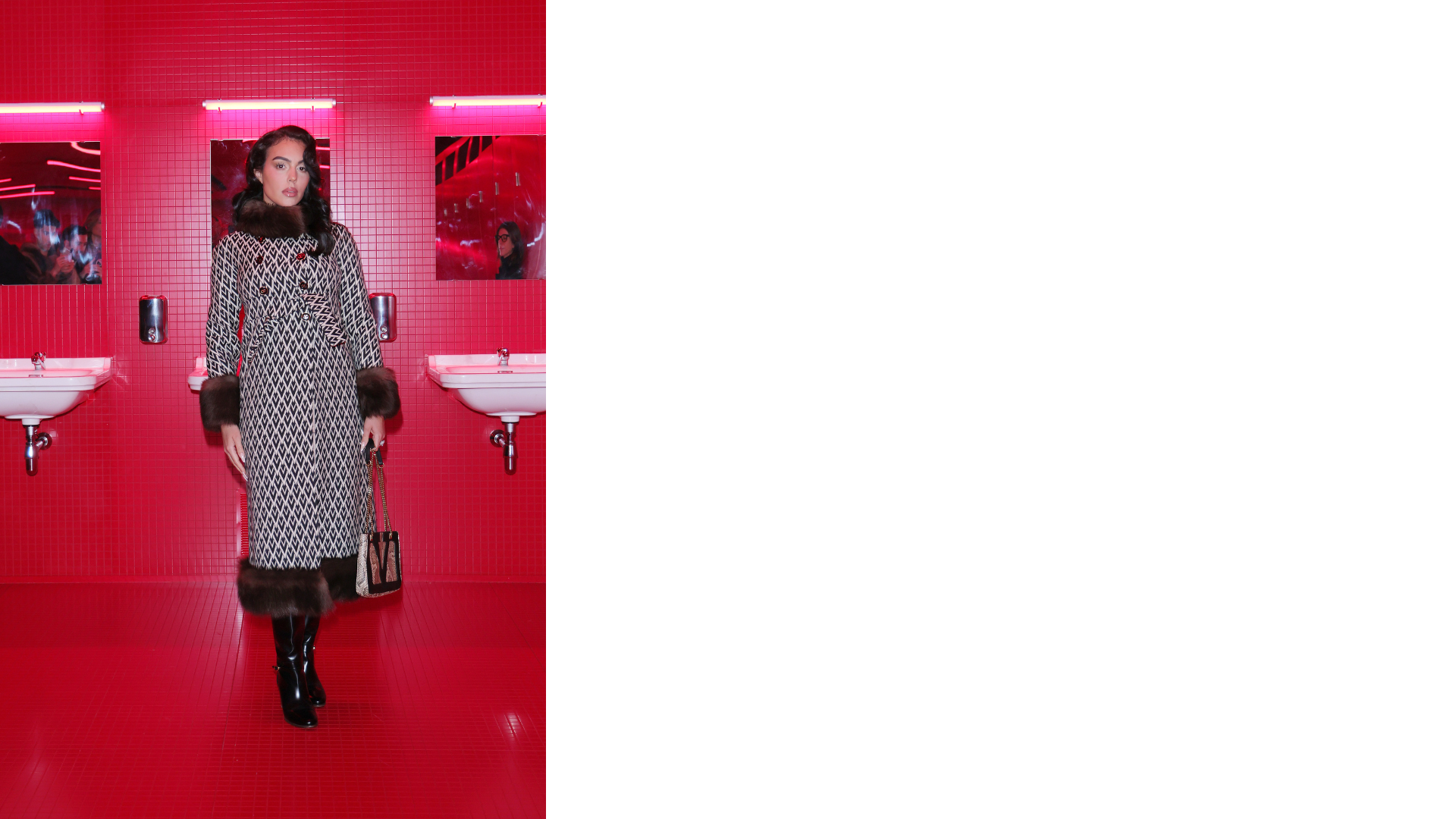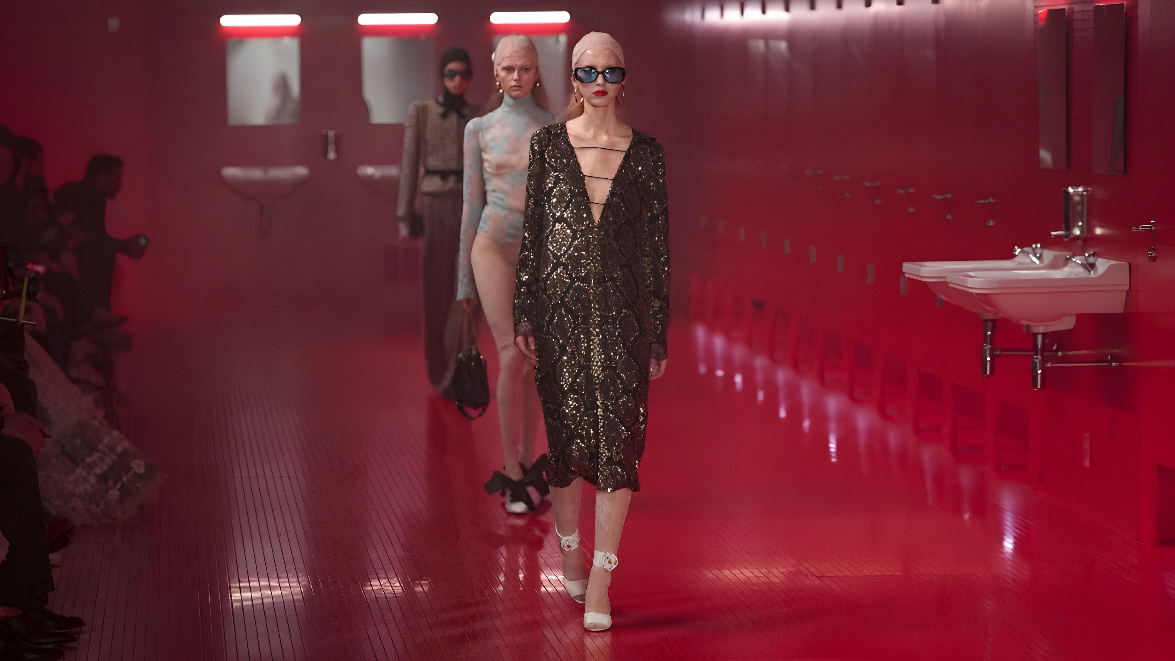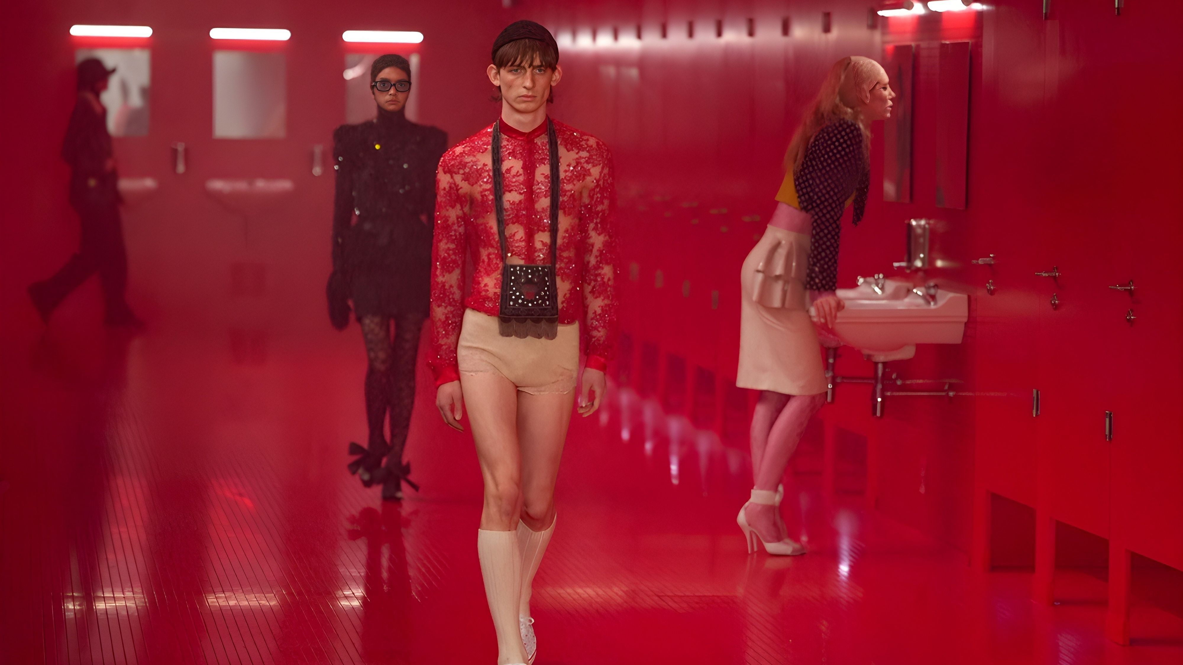A Parigi la seconda collezione ready-to-wear di Alessandro Michele, che ha debuttato nel ruolo di direttore creativo lo scorso settembre, va in scena in un bagno pubblico, luogo di verità e vestizioni. Un po’ club e un po’ voyeur. Un club piastrellato a luci rosse “distopico, perturbante, lynchiano”, costruito nel cortile dell’Istituto di cultura araba: specchi e lavandini, porte che si aprono e chiudono da dove escono modelli e modelle.