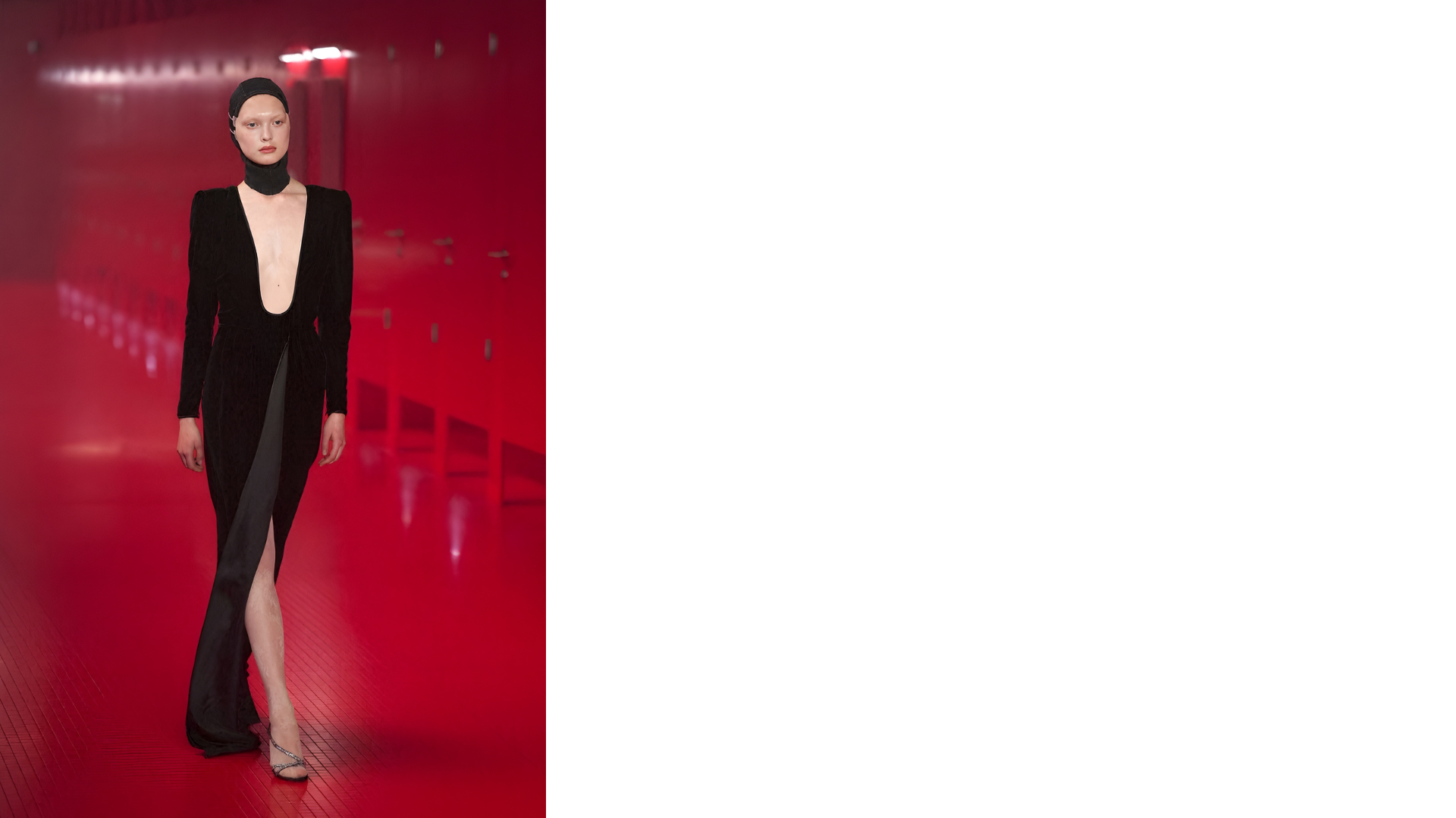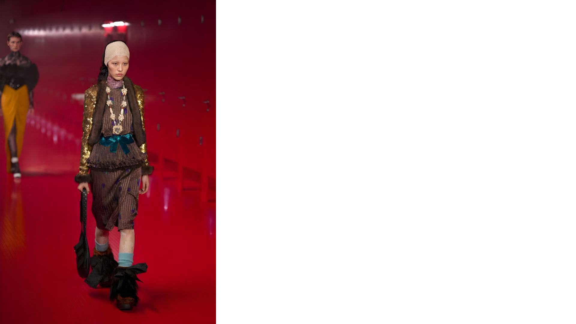Da segnalare anche il ritorno della pelliccia, soprattutto nella versione che non prevede l'utilizzo di materiale di derivazione animale: si abbina ai pantaloni sartoriali, ricoprire interi capispalla o solo maniche, finisce sui profili e sulle bordure. La sfilata porta con sé anche una riflessione sulla bellezza nel tempo, sul cambiamento fisico del corpo. Alcune modelle indossano la cuffia e i patch con elastici per tirare la pelle e levigare le rughe d’espressione. La nudità è evocata, ma mai palese.