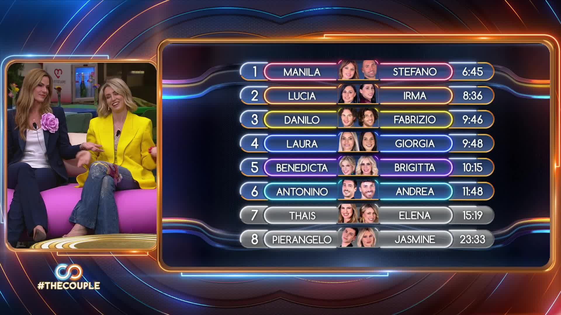 La classifica parziale di queste quattro coppie vede Manila e Stefano al primo posto, seguiti dai fratelli Mileto al secondo, Laura e Giorgia al terzo, e infine Benedicta e Brigitta in ultima posizione.