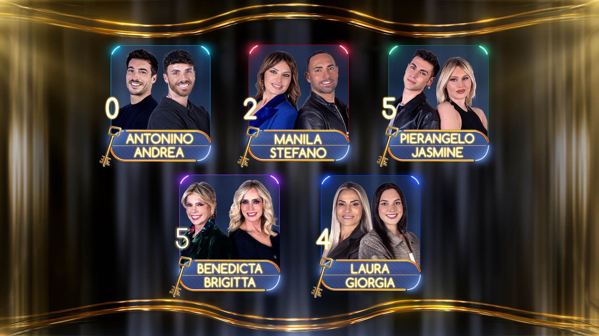 cinque chiavi per la coppia Jasmine e Pierangelo e per le sorelle Boccoli