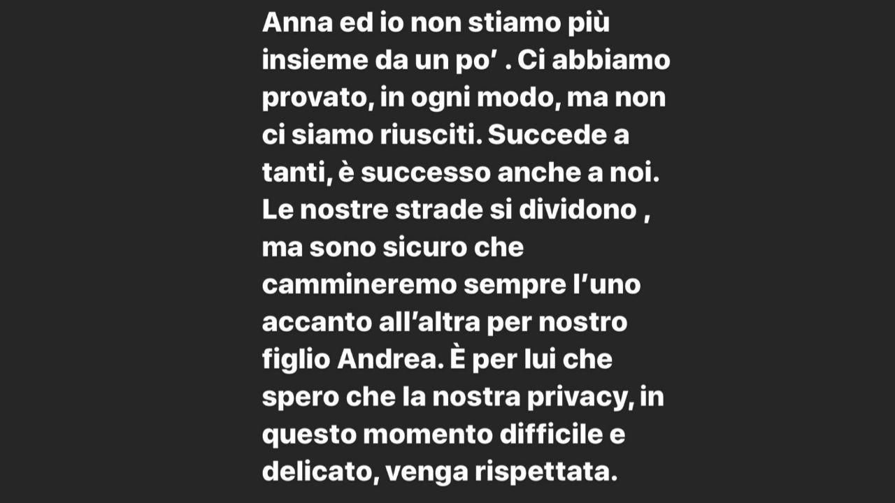 "Succede a tanti, è successo anche a noi" continua la dichiarazione congiunta che i due cantanti, insieme da 15 anni, hanno affidato alle Storie di Instagram. "Le nostre strade si dividono ma sono sicuro che cammineremo sempre l'uno accanto all'altra per nostro figlio Andrea. È per lui che spero che la nostra privacy, in questo momento difficile e delicato, venga rispettata".
