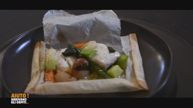 Roberto mostra la preparazione di questo secondo piatto a base di branzino e verdure.