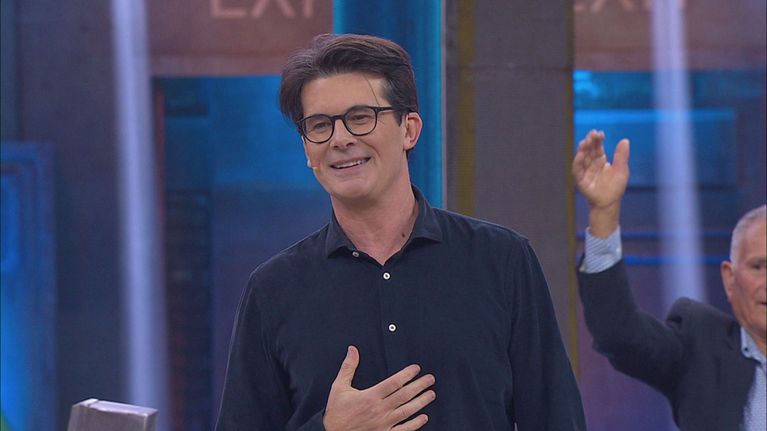 Tutto lo studio di Avanti un altro fa gli scongiuri all'ingresso dello iettatore.