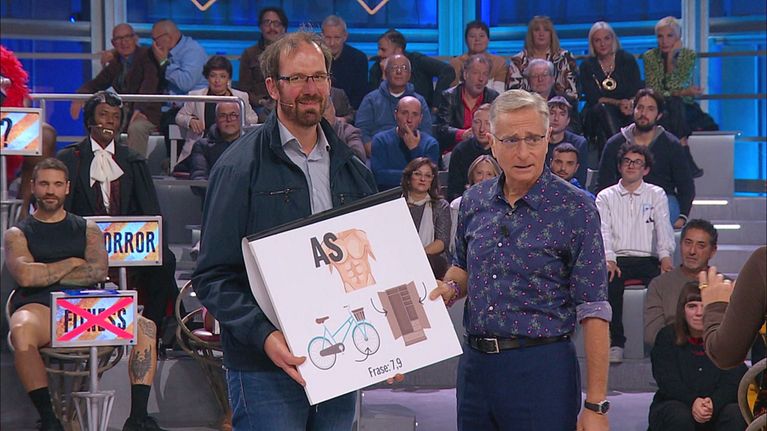 Pintus si siede accanto a Paolo Bonolis per sottoporre i concorrenti alle domande.