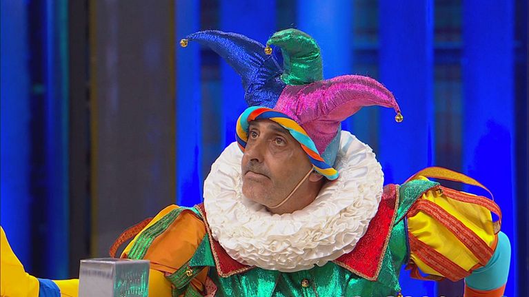 Tutto lo studio di Avanti un altro fa gli scongiuri all'ingresso dello iettatore.
