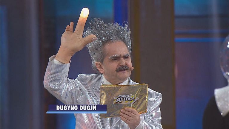 Pintus si siede accanto a Paolo Bonolis per sottoporre i concorrenti alle domande.