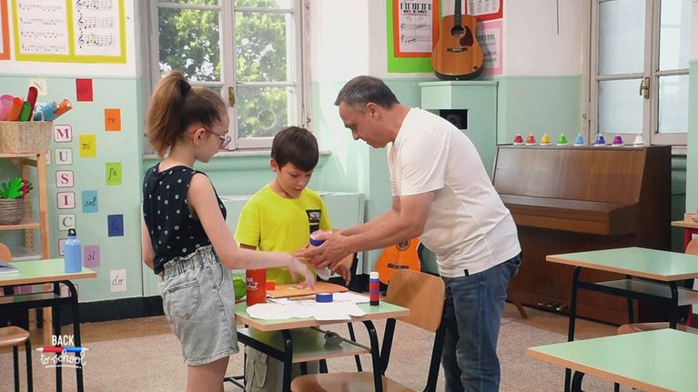 Tra un pezzo di nastro adesivo e l'altro per Gabriele Cirilli e i suoi Maestrini scatta il momento chiacchiere.