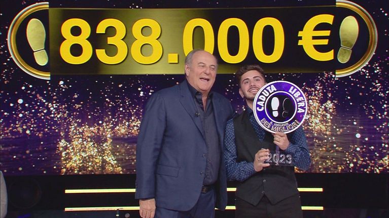 Gerry Scotti accoglie in studio Nicolò Scalfi, vincitore della quinta puntata del torneo di Caduta Libera.