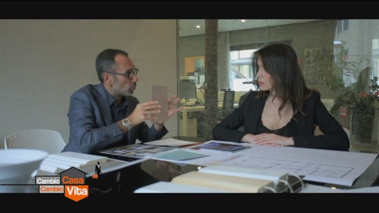 Andrea illustra a Paola la sua scelta dei nuovi colori, romantici ed eleganti con tonalità ricorrenti in tutta la casa.