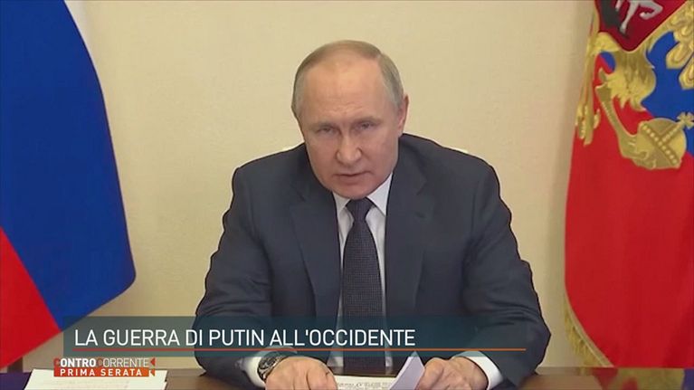 Putin: l'uomo forte che sfida l'occidente e si prende cura della sua terra. Appena compare sul palco si elevano i cori.