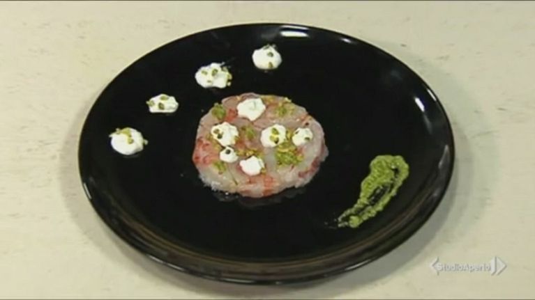 Battuta di gamberi con burrata e pistacchi