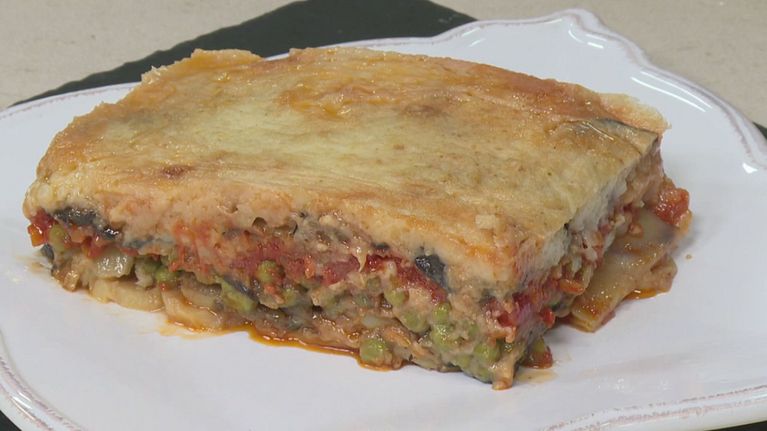 Moussaka ai piselli con besciamella all'acqua