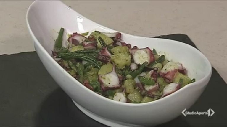 Le patate sono un classico accompagnamento del polpo, ma con l'aggiunta di fagiolini e pesto risulterà davvero squisito!