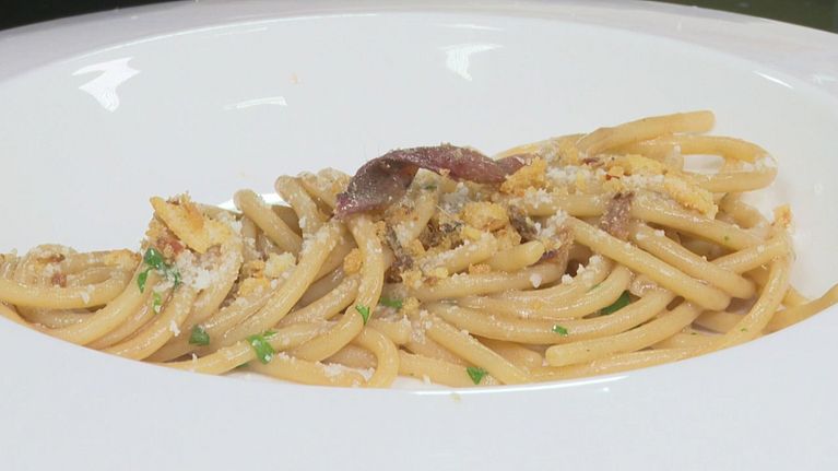 Spaghetti aglio nero e olio con crumble di pane alle acciughe