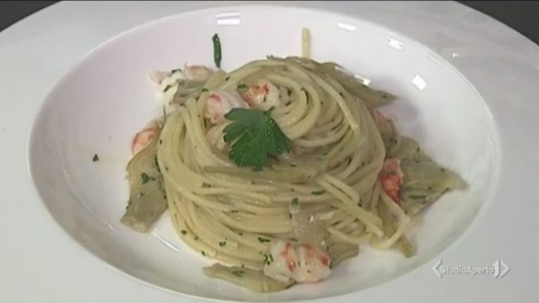 Spaghetti con carciofi e gamberi