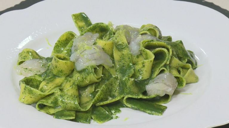 Tagliatelle di mais, cavolo nero e canocchie