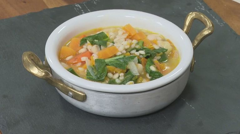 Una minestra di orzo, verdure e fagioli.