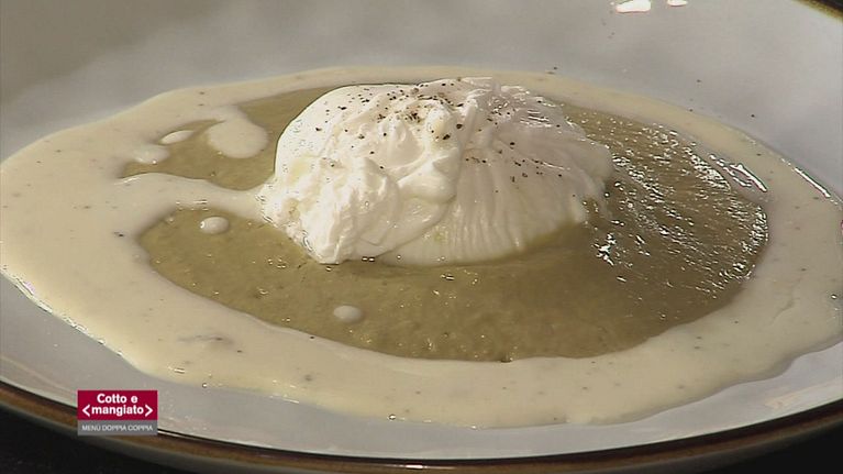 Merluzzo scottato su emulsione di lattuga e luppolo selvatico e uovo pochè e fonduta di taleggio