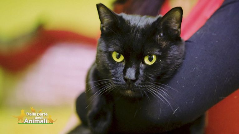 Un bellissimo micione nero con dei grandi occhi gialli