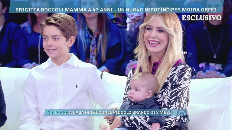 Brigitta Boccoli è diventata mamma a 47 anni e oggi, con il marito Stefano Orfei ed il figlio più grande Manfredi, presenta a Barbara il suo secondo genito.