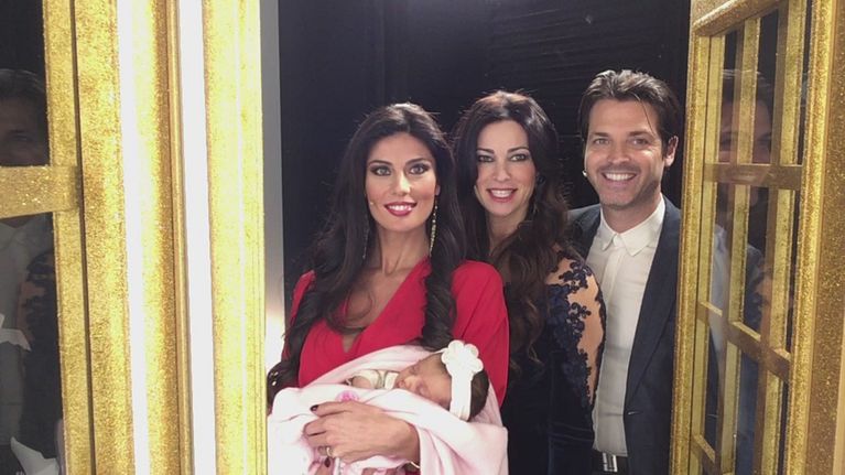 Brigitta Boccoli è diventata mamma a 47 anni e oggi, con il marito Stefano Orfei ed il figlio più grande Manfredi, presenta a Barbara il suo secondo genito.