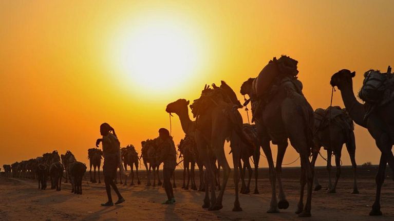 Scenario inatteso di una bellezza primordiale, unica, che si estende a perdita d'occhio,dove carovane di cammelli sfilano in una dimensione senza tempo.