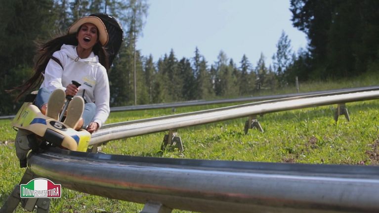 Giunte ad Auronzo di Cadore, le ragazze si divertono a bordo del Fun Bob più lungo del mondo.