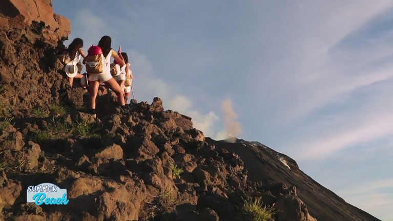 Le ragazze percorrono la cosiddetta "strada del fuoco" che le condurrà in cima al vulcano Stromboli.
