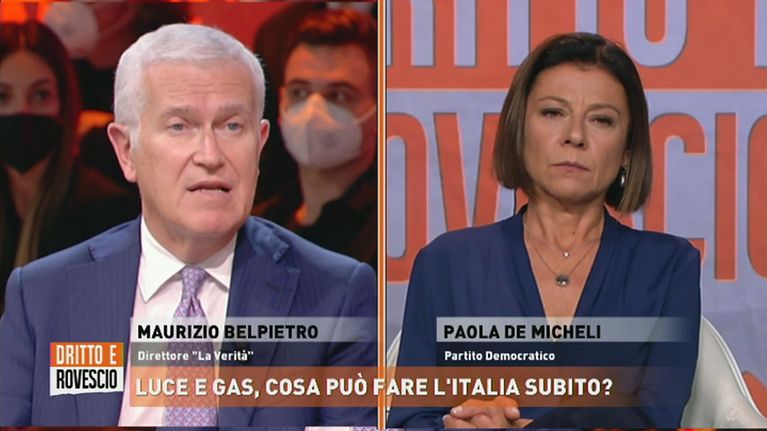 Il dibattito fra gli ospiti di Dritto e Rovescio, tra cui il giornalista Maurizio Belpietro e Paola De Micheli (PD).
