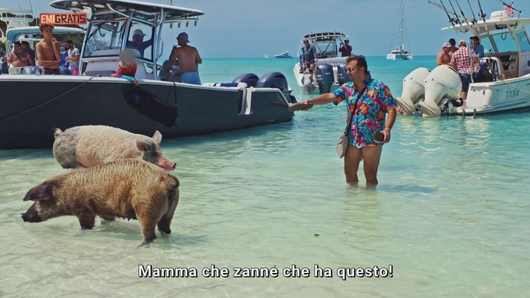 Dopo un bellissimo volo, Pio e Amedeo si godono la famosa "Pig Island", l'isola dove i maiali nuotano felici.
