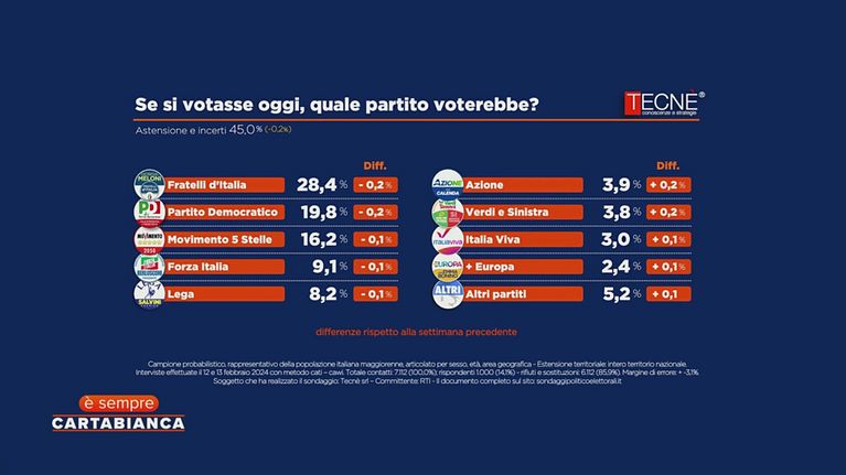 Quale partito voterebbero gli italiani se si votasse oggi? I dati per E' Sempre Carta Bianca.