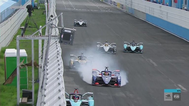 Subito traffico e caos nel gruppo 1 che apre le qualifiche dell'E-Prix di Puebla: Frijns è costretto al bloccaggio per evitare di andare lungo in curva 1