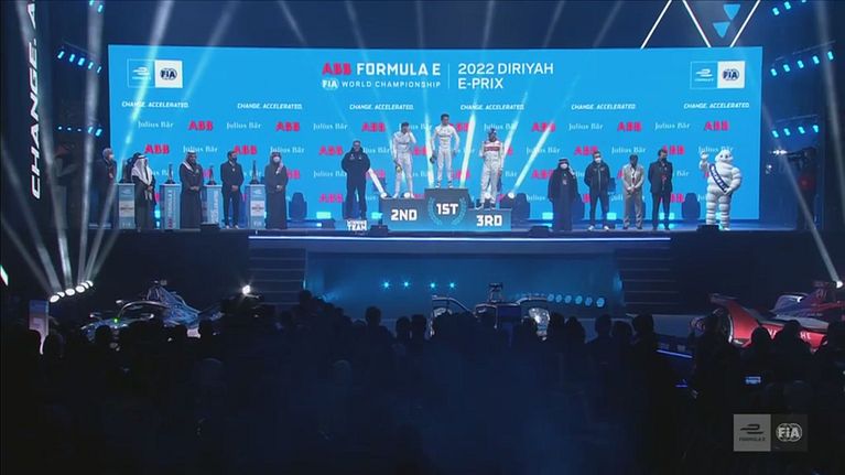Il podio di gara-1 dell'E-Prix di Diriyah: doppietta Mercedes con De Vries e Vandoorne, terzo Dennis su Andretti