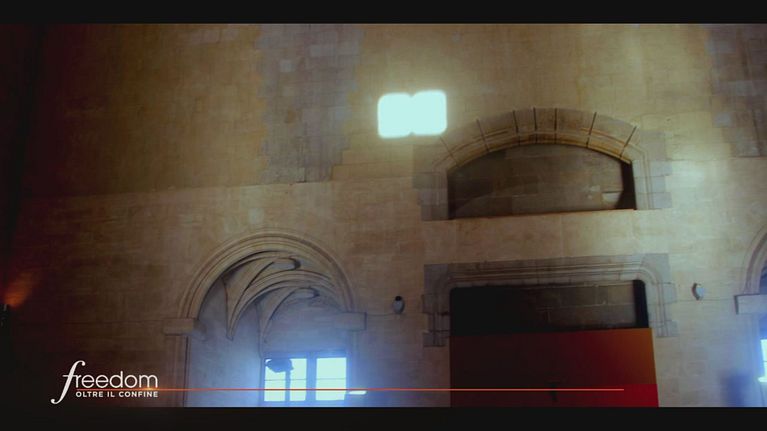 Passando attraverso uno spiraglio, un fascio di luce proietta nella parete di fronte al trono della Basilica del Maschio Angioino un libro, un vero e proprio simbolo di conoscenza.