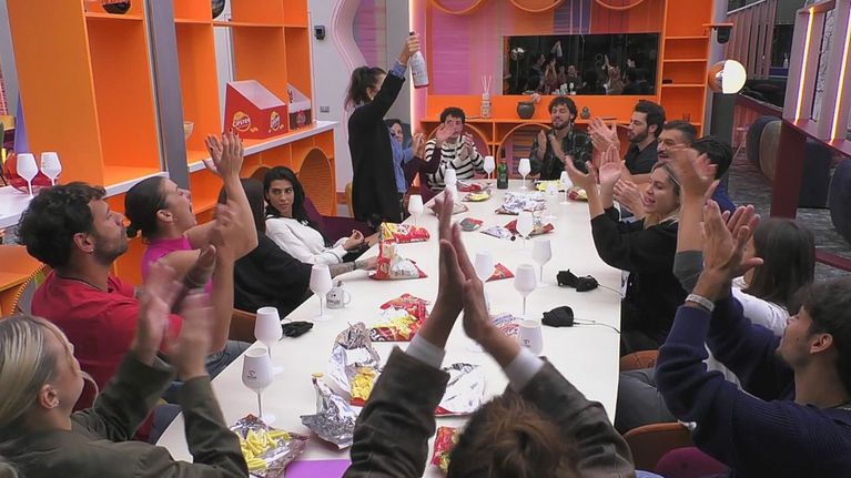 È il momento del brindisi: i Casalinghi stappano lo spumante Puntocuore, leggono la dedica e alzano i calici