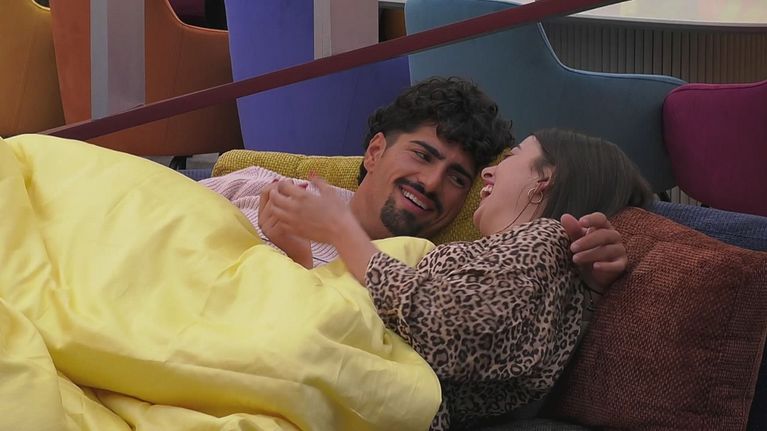 Avvolti nella stessa coperta, Benedetta Stocchi e Giulio Carotenuto si scambiano sguardi complici e teneri abbracci, tra i commenti sorpresi degli altri inquilini