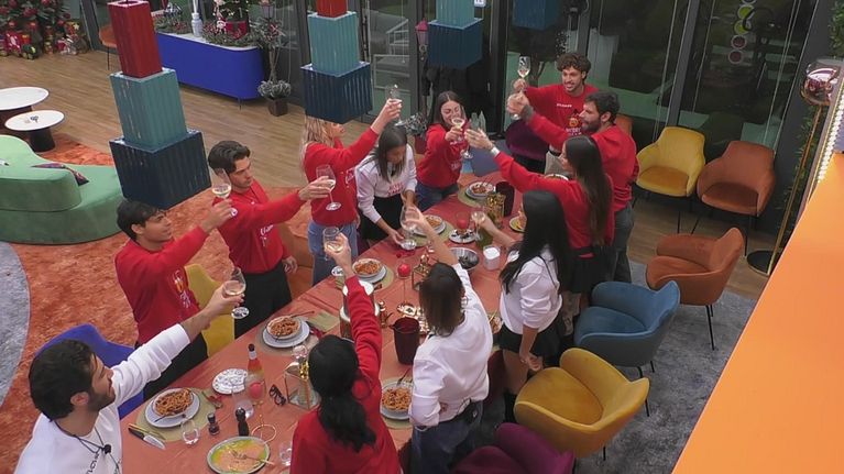Domenico versa lo spumante Puntocuore e i Casalinghi brindano insieme, celebrando l'arrivo del Natale