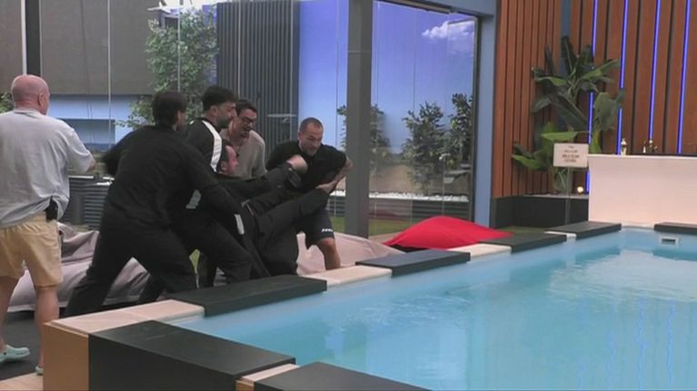 Alcuni concorrenti pianificano uno scherzo e trascinano Giovanni Calvario in piscina completamente vestito