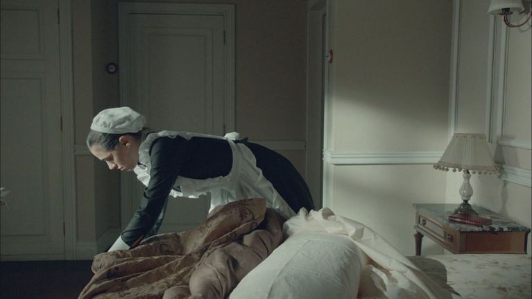 Una cameriera, rifacendo il letto di Javier, trova sotto la coperta un coltello d'oro con la punta mozzata, probabilmente l'arma con cui è stata uccisa Jimena. Lo porta ad Angela, che a sua volta va da Donna Teresa. Costei chiama il figlio Javier e gli ordina di nasconderlo nella camera di uno dei camerieri