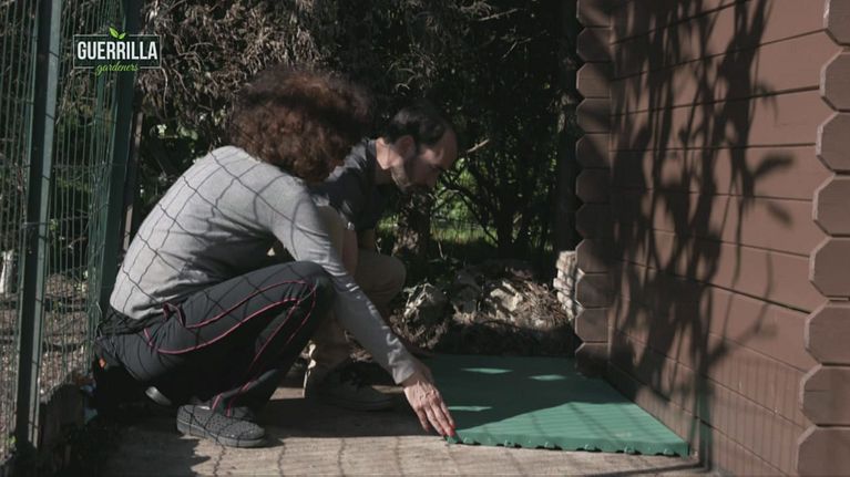 Antonella e Filippo dovranno montare il pavimento in plastica attorno alla casetta che hanno ridipinto.