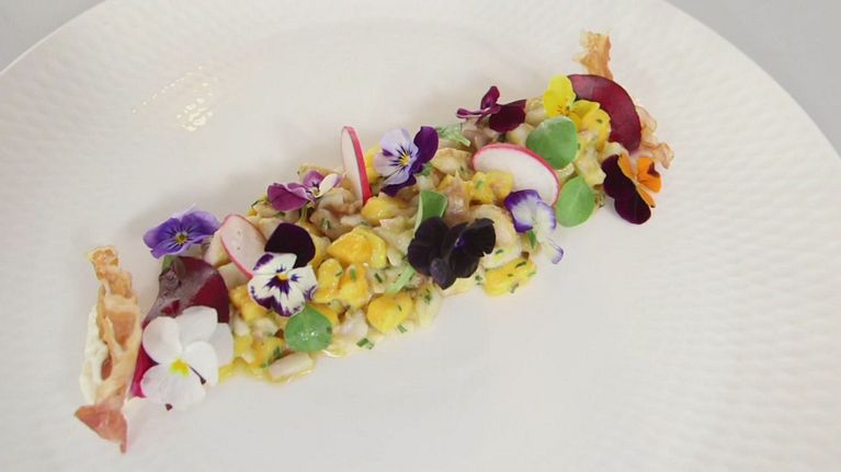 Il primo piatto preparato da Matteo è un tortino di ricciola con crema di zucca.