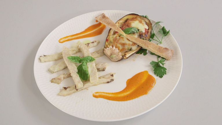 Un filetto di ombrina accompagnata da melanzana e focaccia.